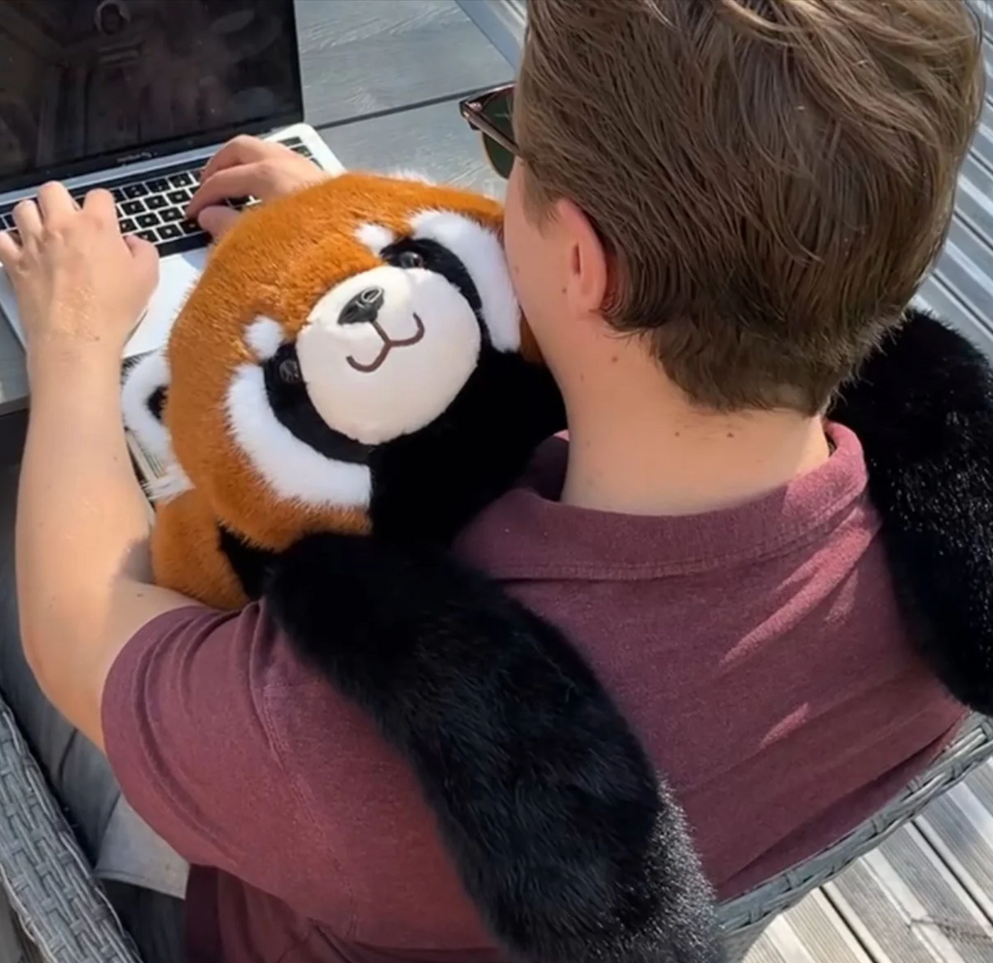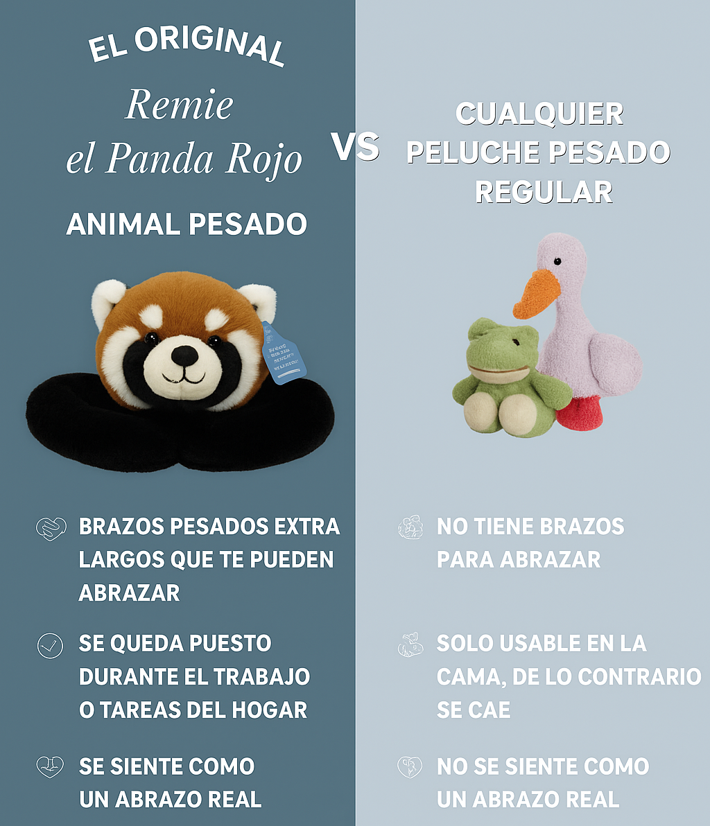 Por eso diseñamos nuestros animales con peso de forma diferente. Remie, el panda, tiene brazos extra largos con peso que te envuelven y se quedan quietos mientras trabajas, lees o navegas por el teléfono. Remie es como una manta con peso para llevar puesta, ¡pero mucho más suave y práctico!